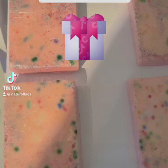 Este singular jabón de edición limitada está realizado con 3 mantecas (shea , cocoa y mango ) , su tono rosado es de óxidos y sus decoraciones contienen brillo soluble en el agua (eco safe) , sales , jojoba beads, entre otros . Su fragancia nos recuerda a los pasteles de Cumpleaños. Tamaño de 4 oz